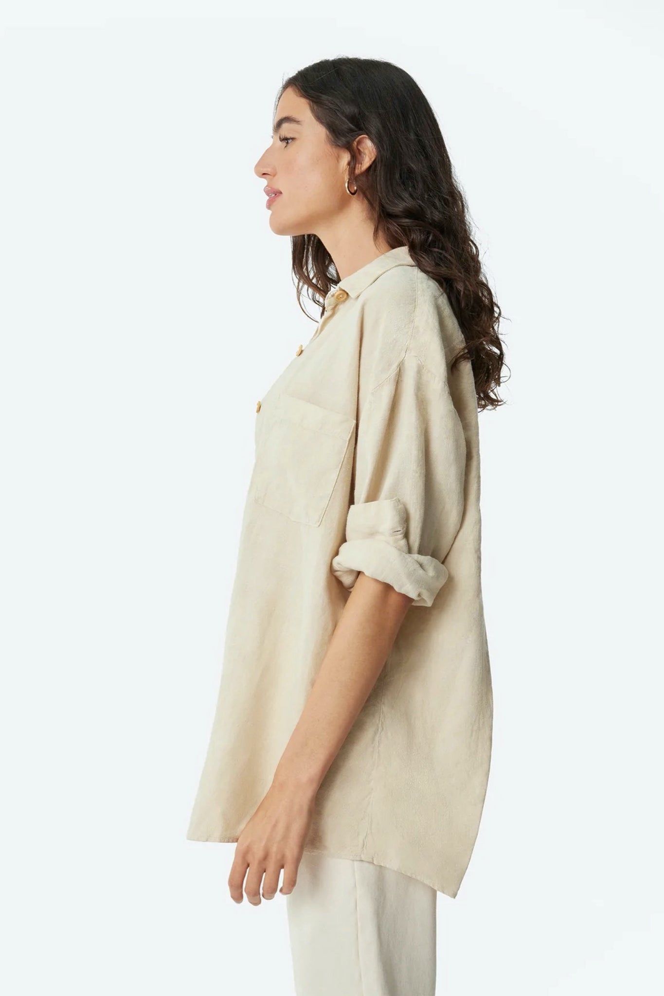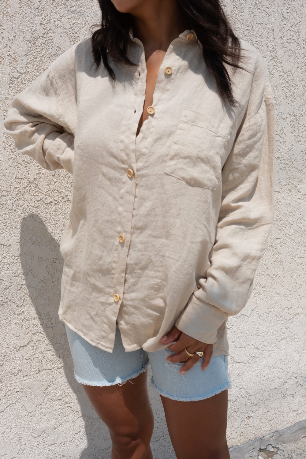 This long sleeve button-down is made with 100% Natural Linen and detailed with all-natural pear wooden buttons. The relaxed fit and oversized sleeves create an effortless vibe whether you crop the shirt up with a front knot or let the Linen hang loose for a breezy style.