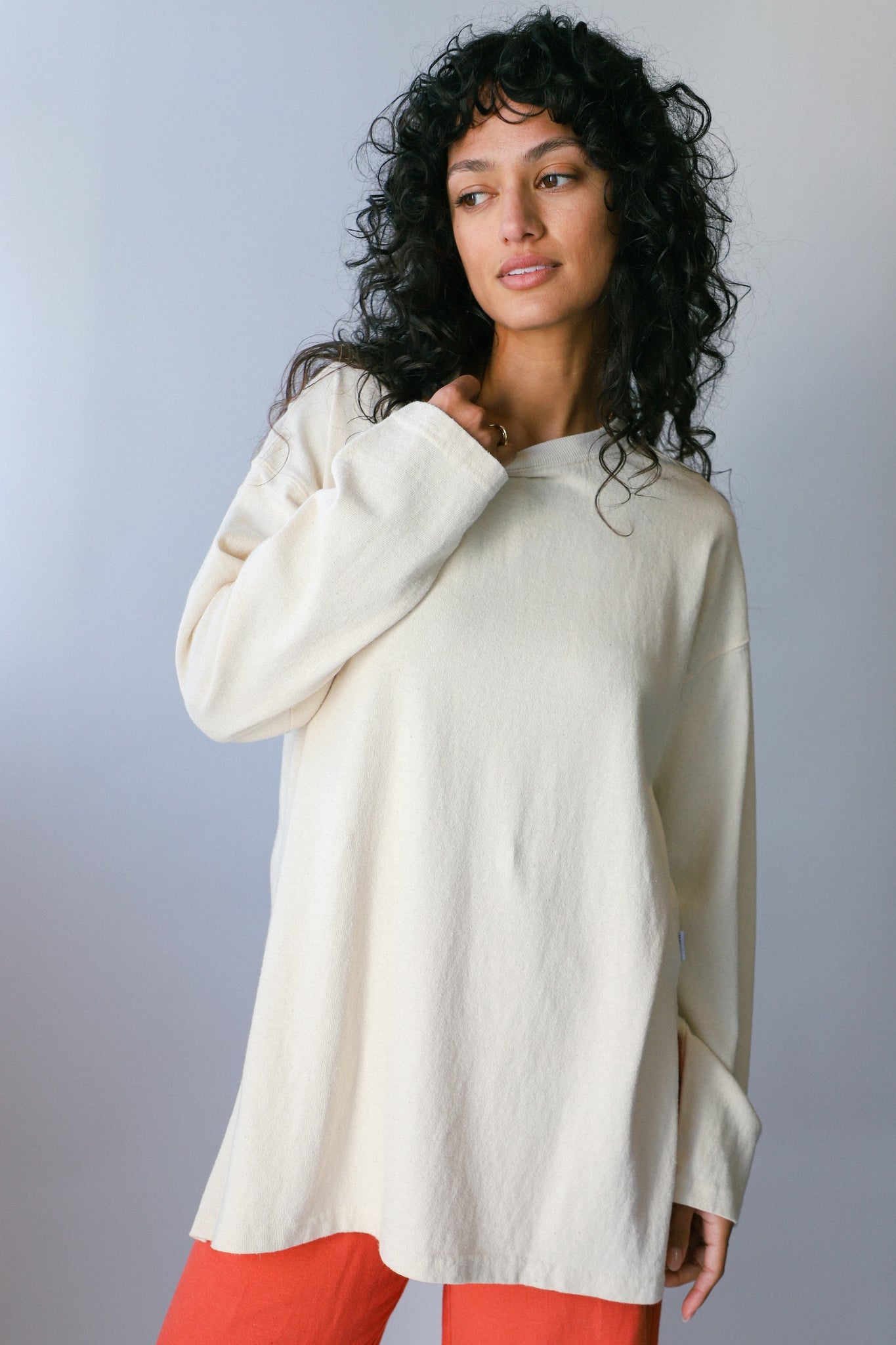Subtle yet playful high side slits transform this simple piece into a fun closet staple. Sleeves are wide enough to roll up!
