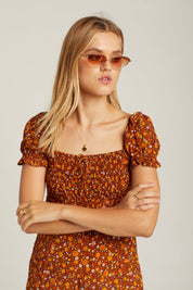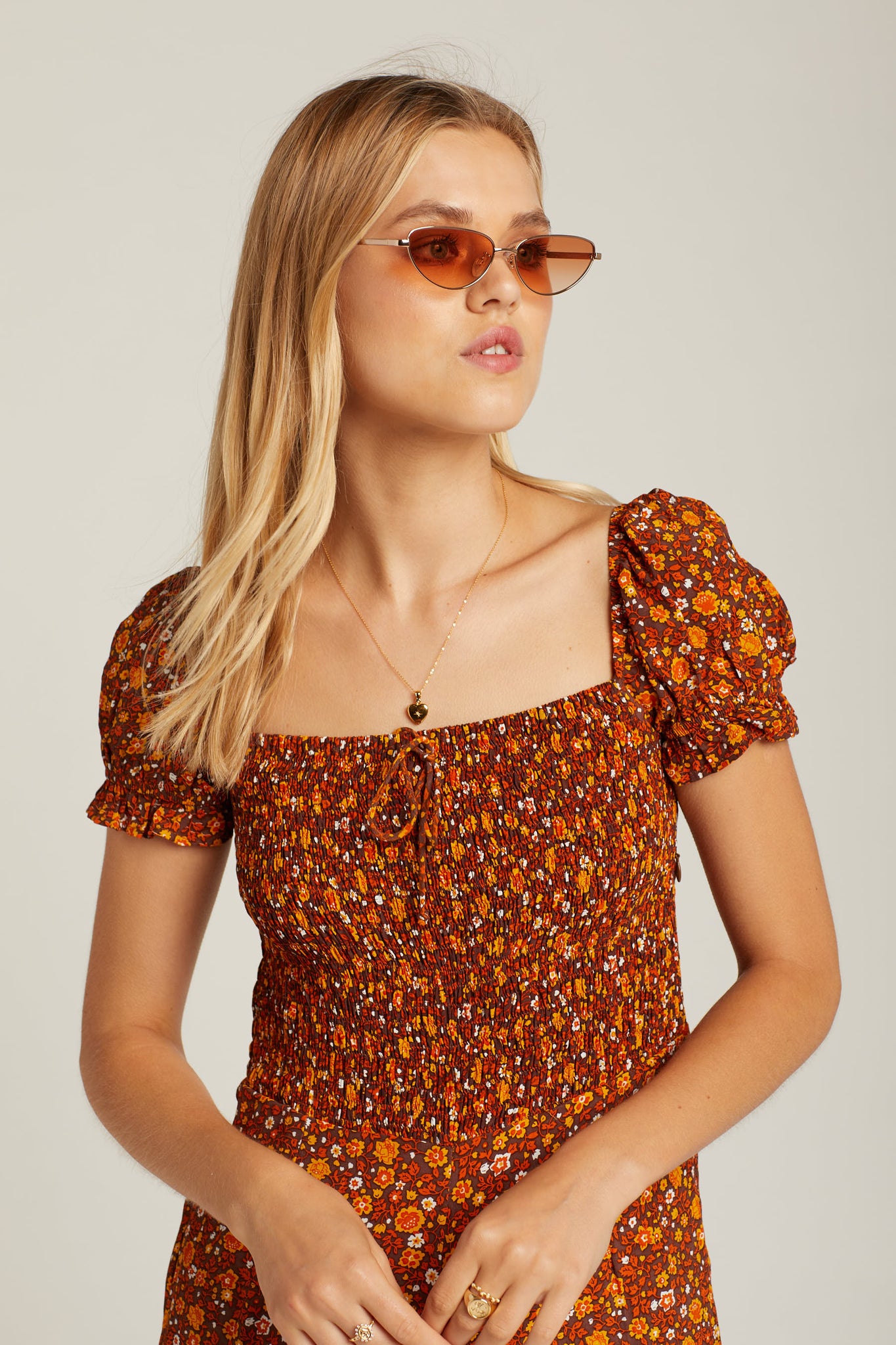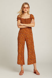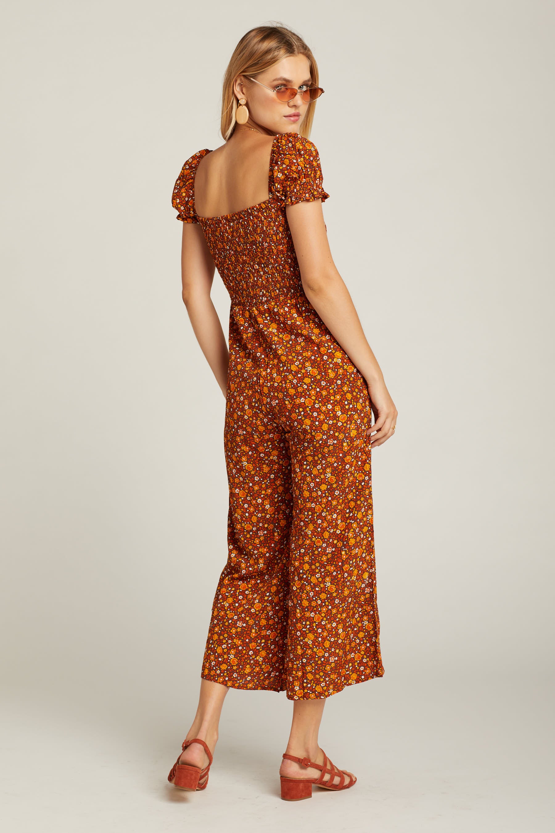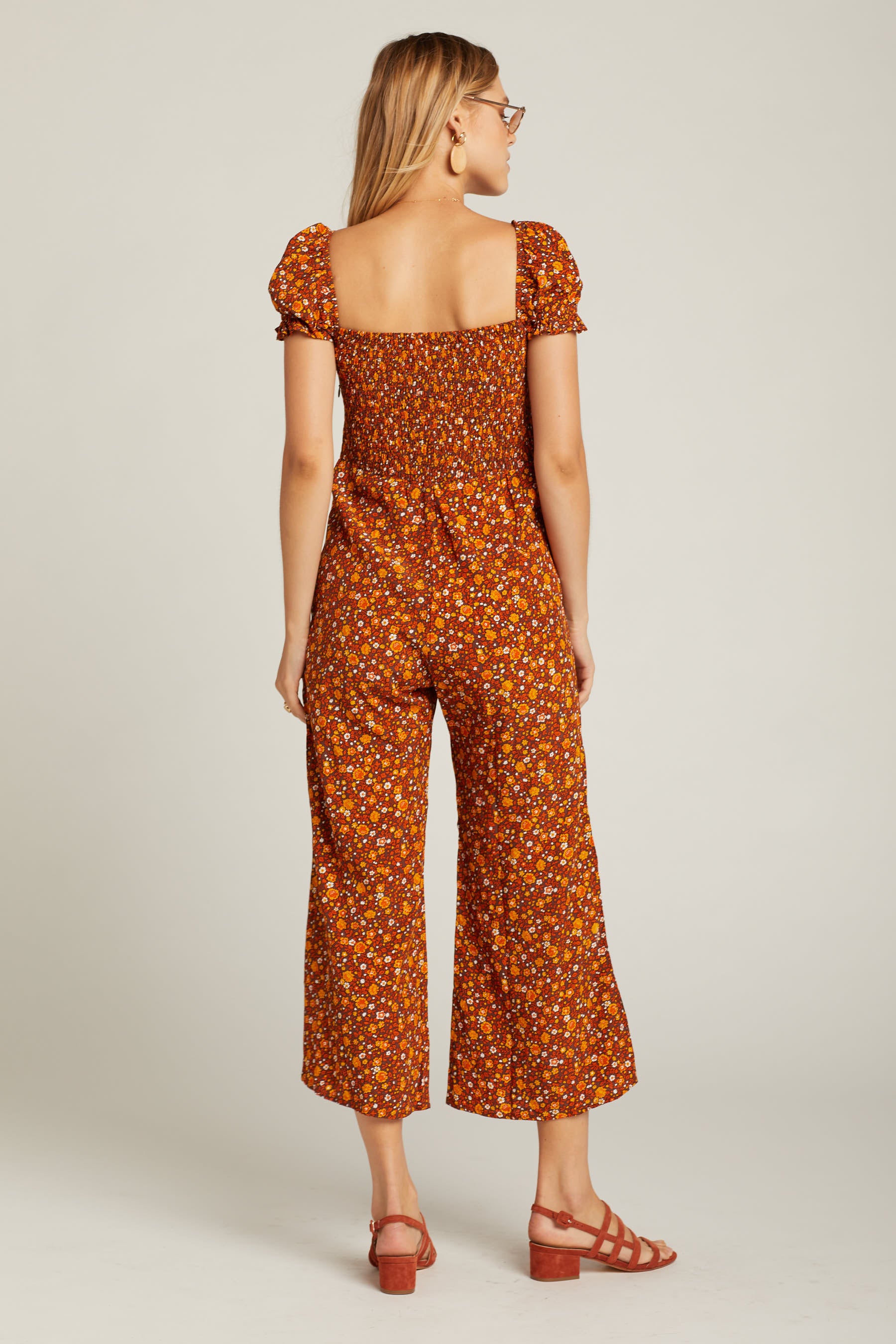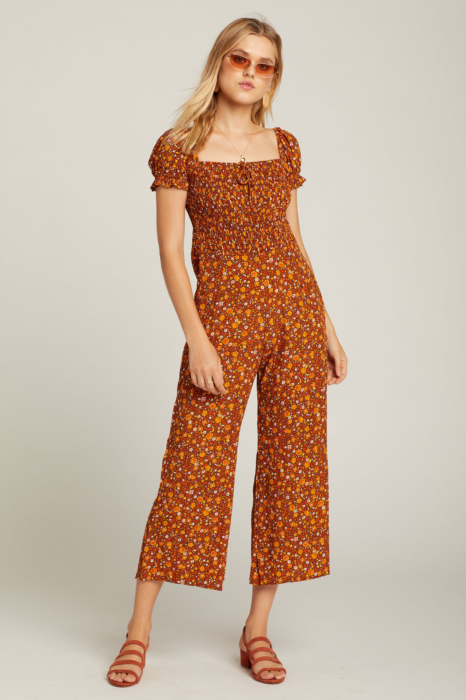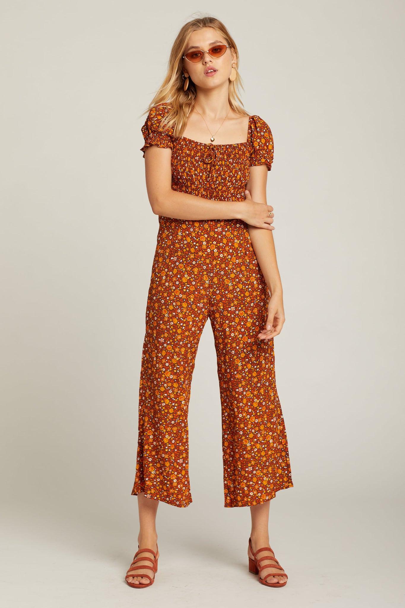 The sweetest jumpsuit that gives off a very retro vibe. Features a smocked bodice, puff sleeves, and a little bow detail.