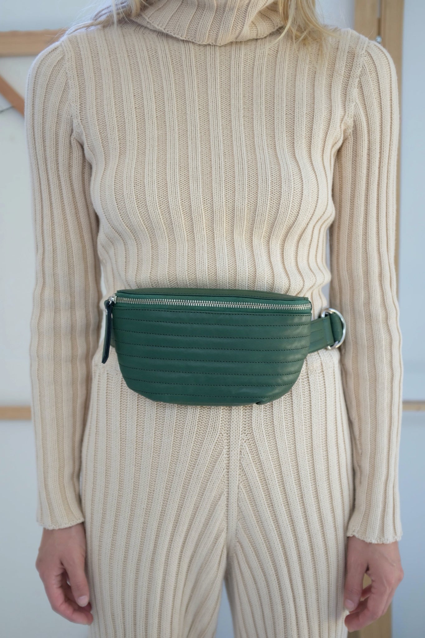 Just the right sized fanny pack, fully lined, zipper closure, ribbed all over, adjustable belt. Fits phone, keys, money and the essentials.