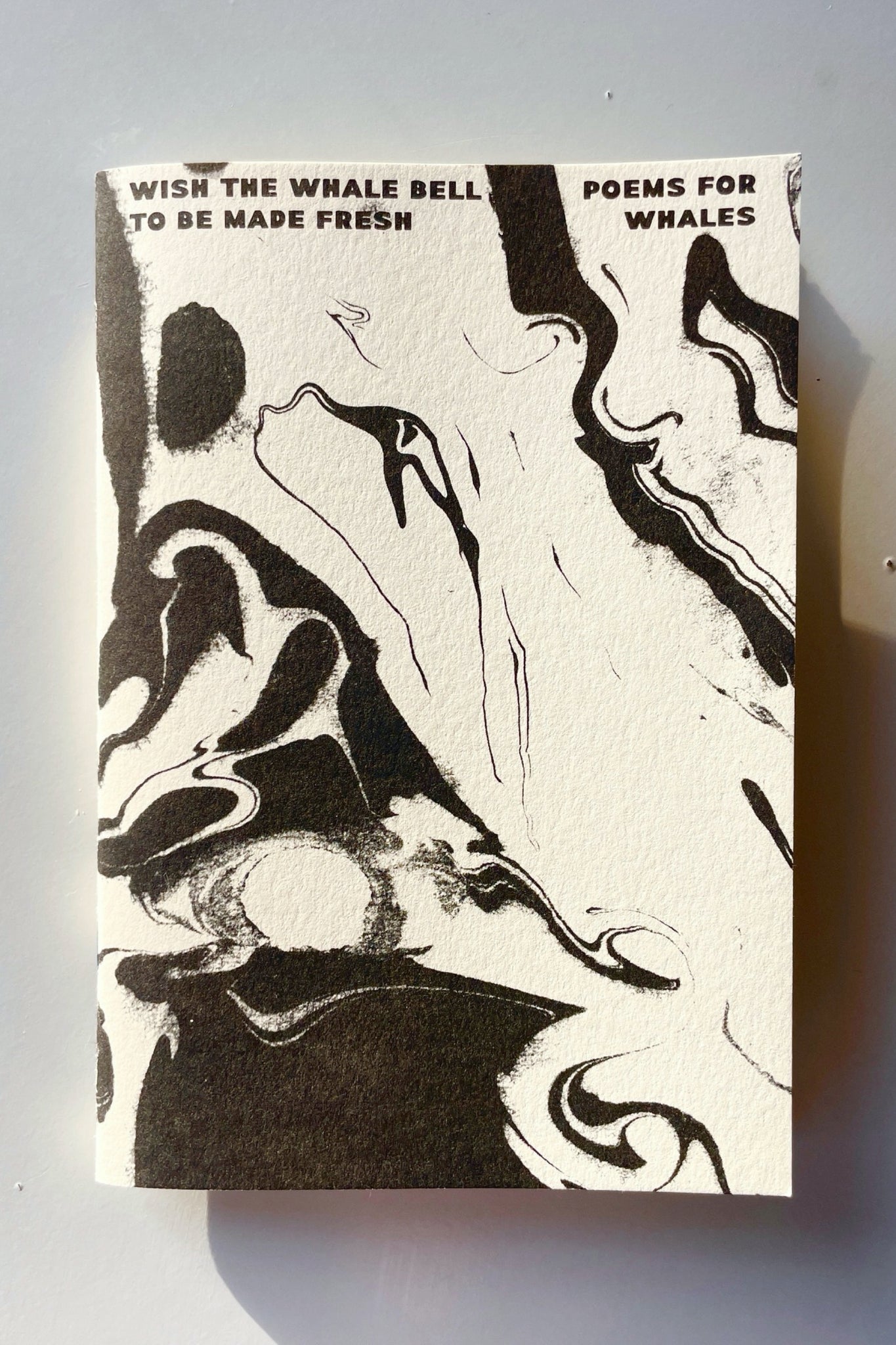 Some poems touch on whales and most float nearby. It’s a collective wish for the whole container of whales, the ocean, and the concept of protecting and relating to them, to be made fresh. The cover is a soft cotton paper. Suminagashi prints represent the echos of whale song. All profits from the sale of this book to be donated to The Ocean Conservancy.