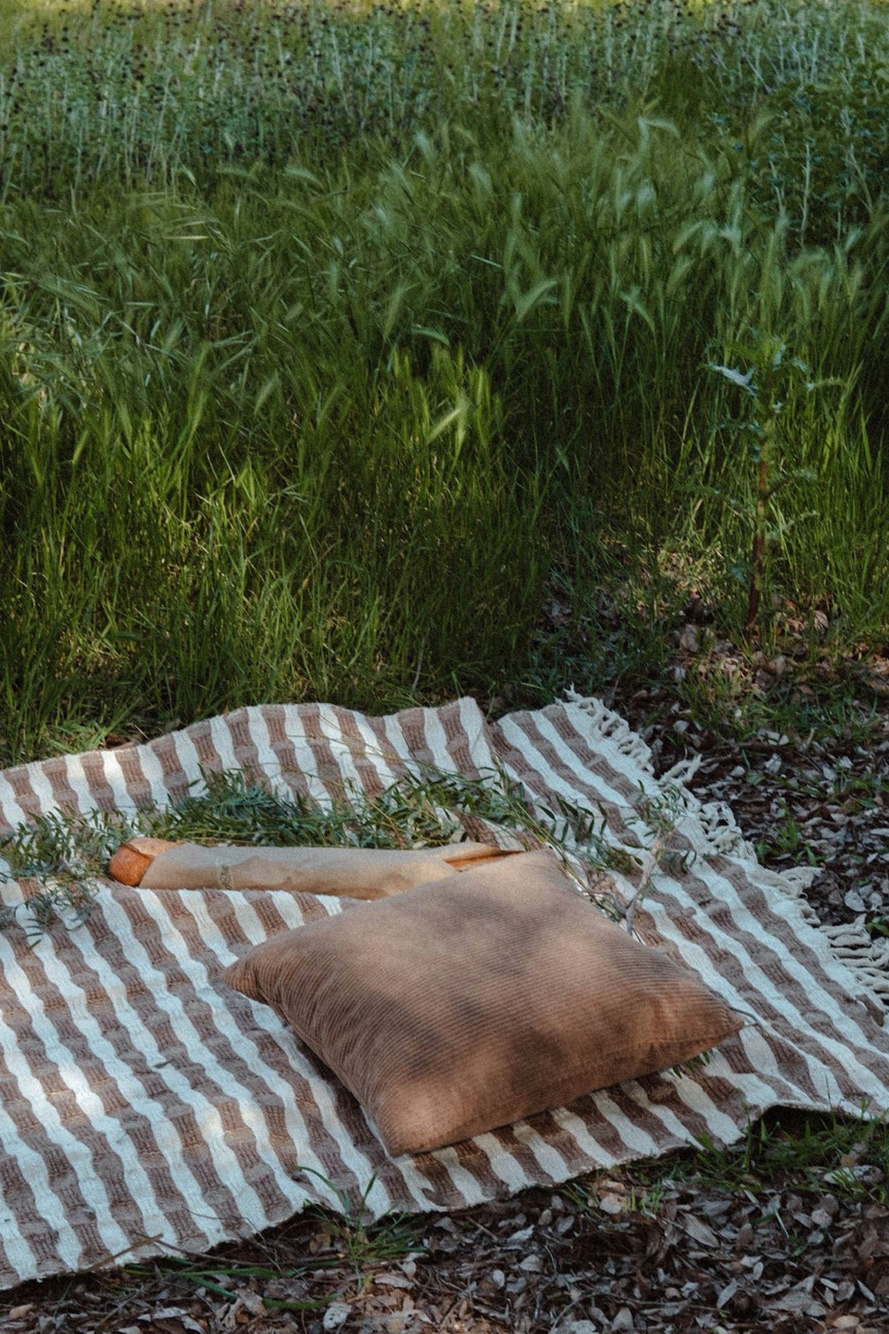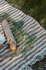 Ramona is a beautiful blanket featuring a warm brown textured stripe pattern on a cream background. This soft and lightweight cotton blanket is machine washable, perfect to take from the couch to the park or the beach.