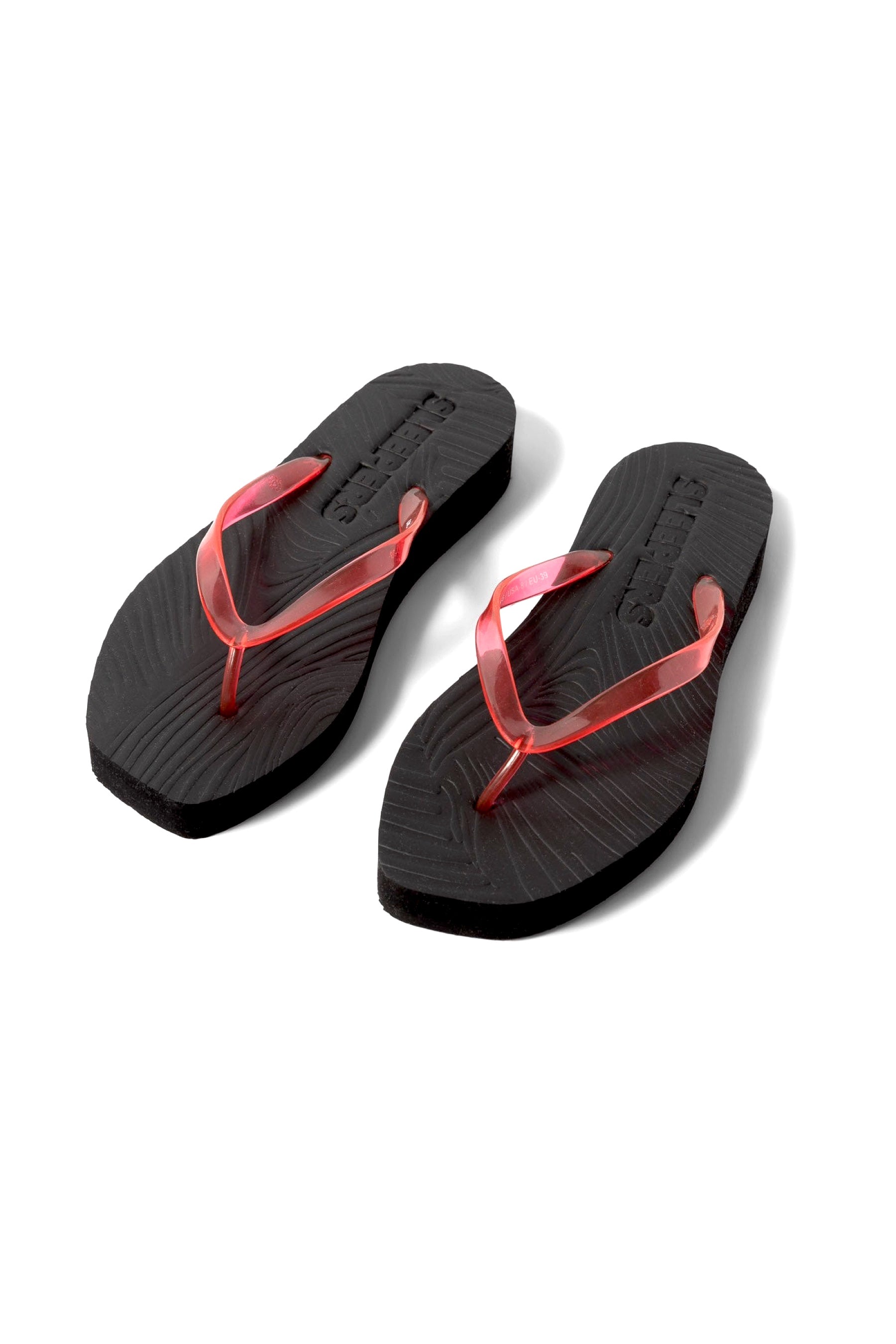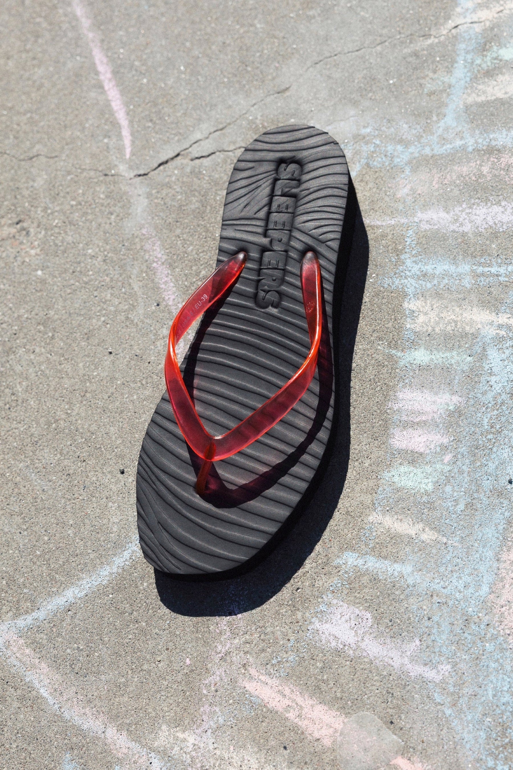 Minimalistic inspired flip flop with natural rubber platform sole and recycled transparent plastic strap The black sole and bold red strap creates a striking and daring combination, perfect for modern sophistication.