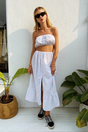 Skirt: Waist 24”-42”, Length 31.5”, Long-sleeve top: Bust 36”, Elastic 22”-40”, Bandeau: Bust 24”-38”, Width 8”