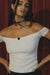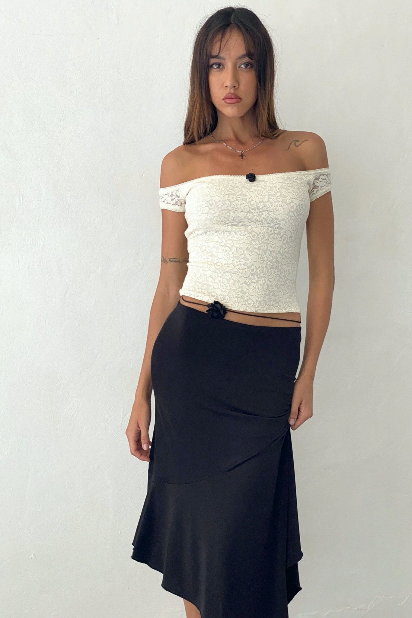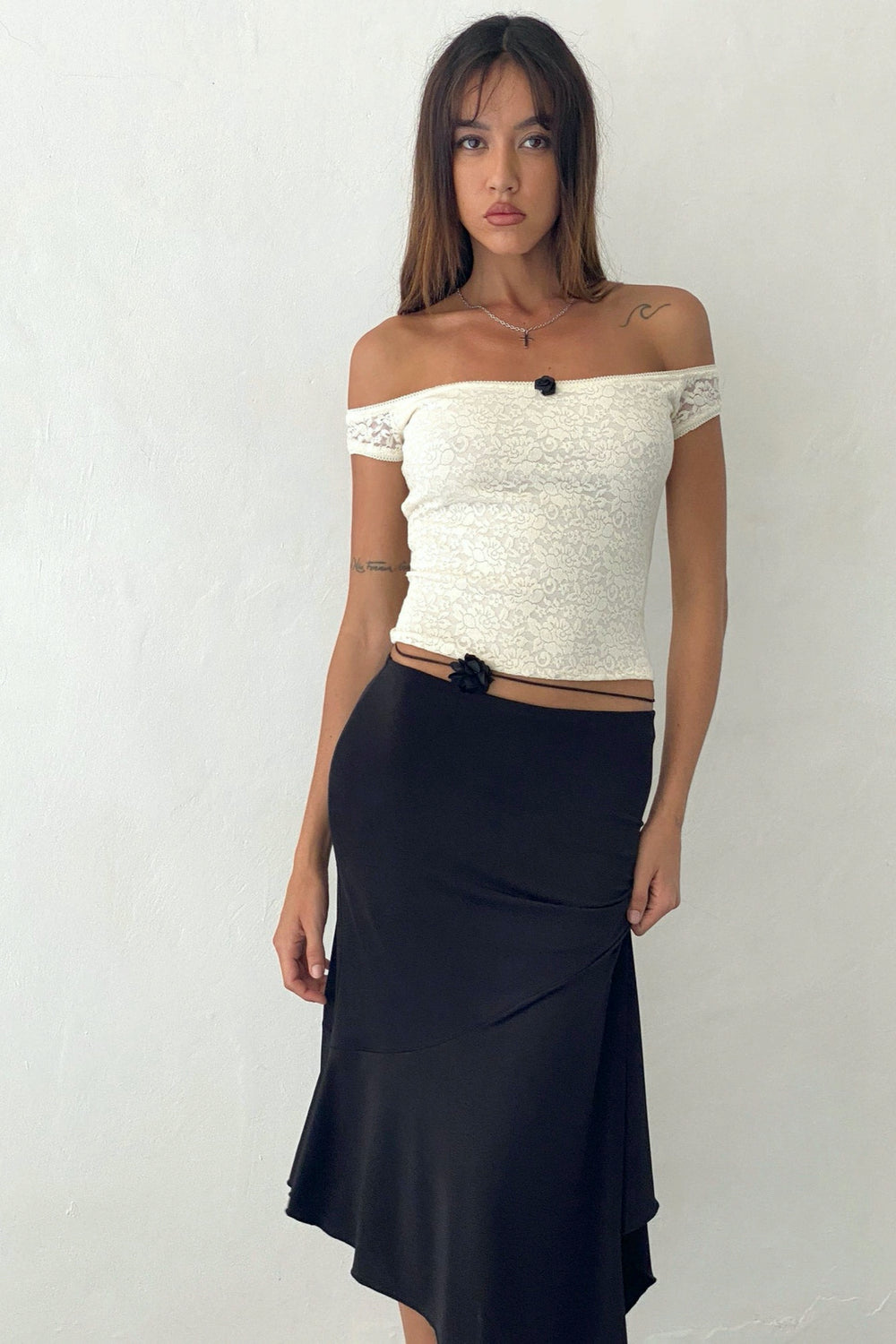 A lace top for every occasion. The Lonnie top, in a soft rose ivory lace, features an off the shoulder bardot neckline with elasticated sleeves and a black rose detail on centre bust.