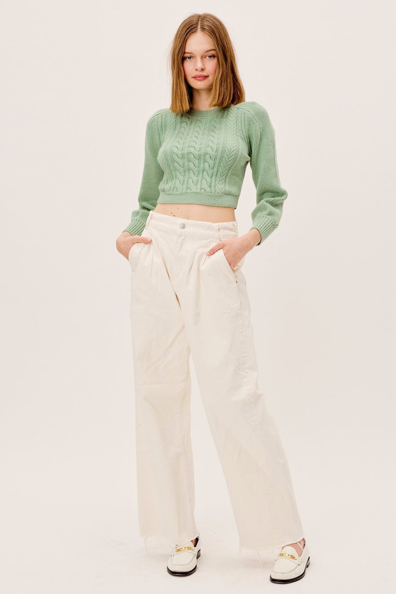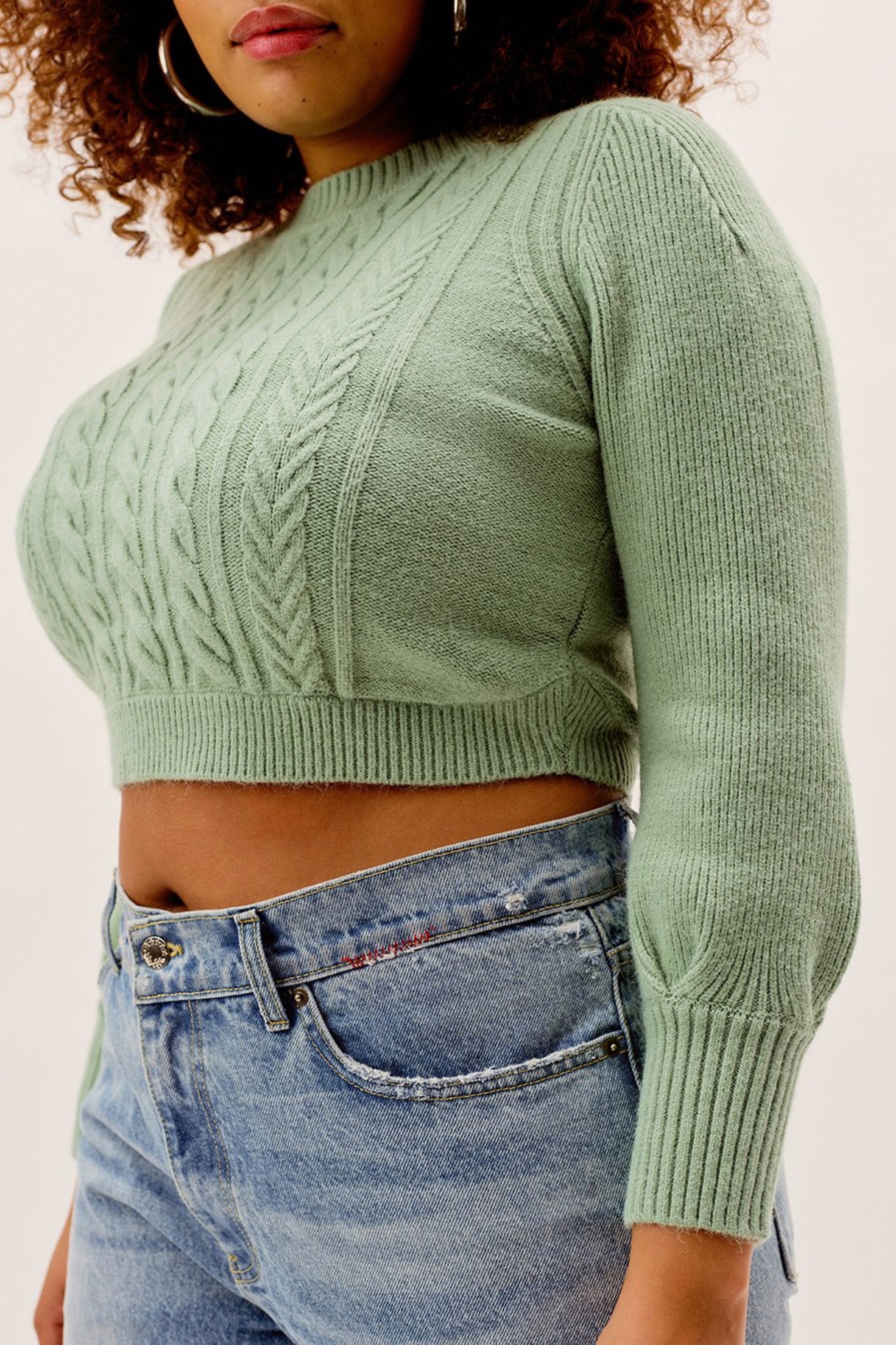 Cropped and cozy sweater featuring cable and ribbed knit detailing, crew neckline, and pleated cuffs.