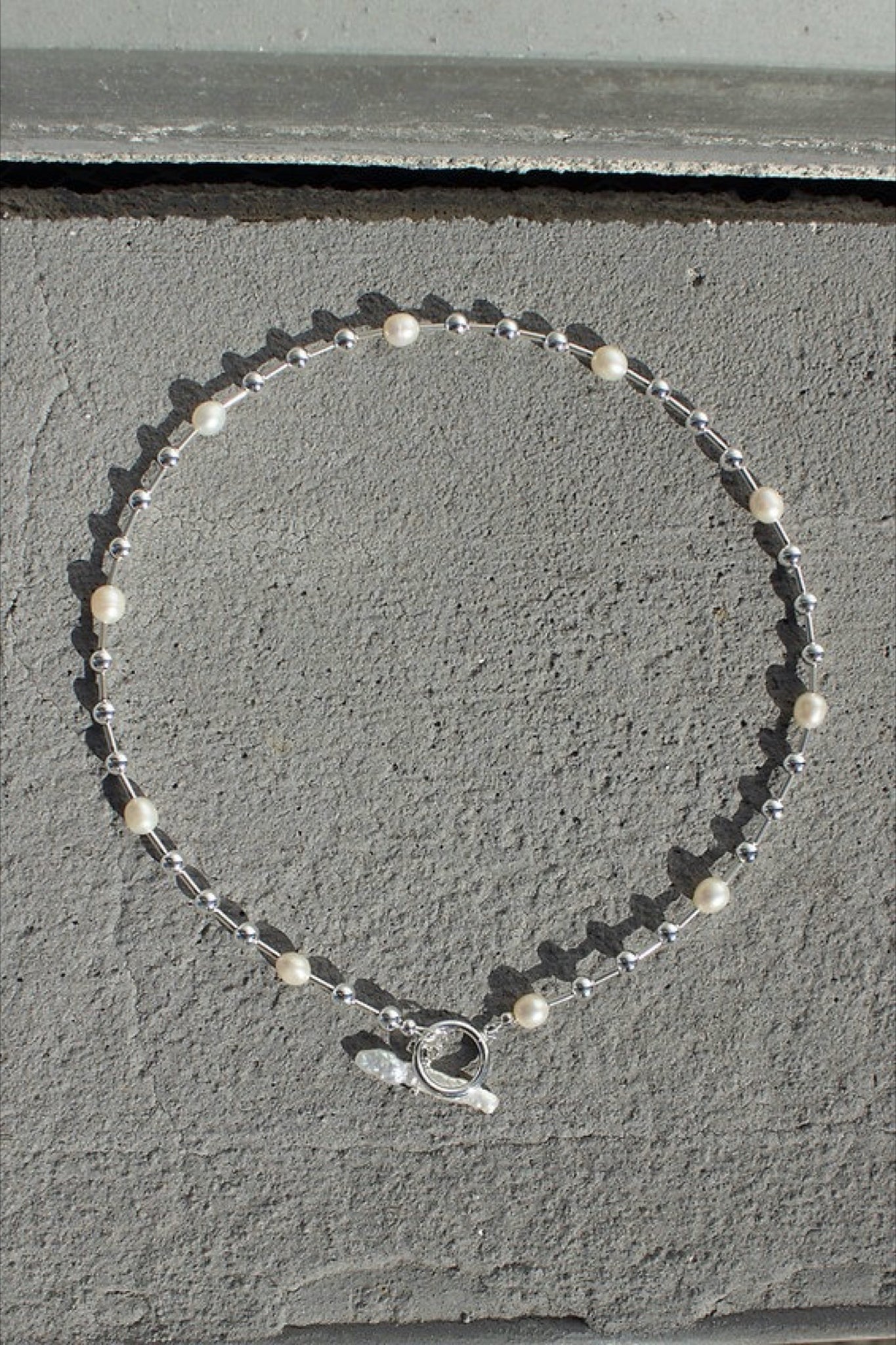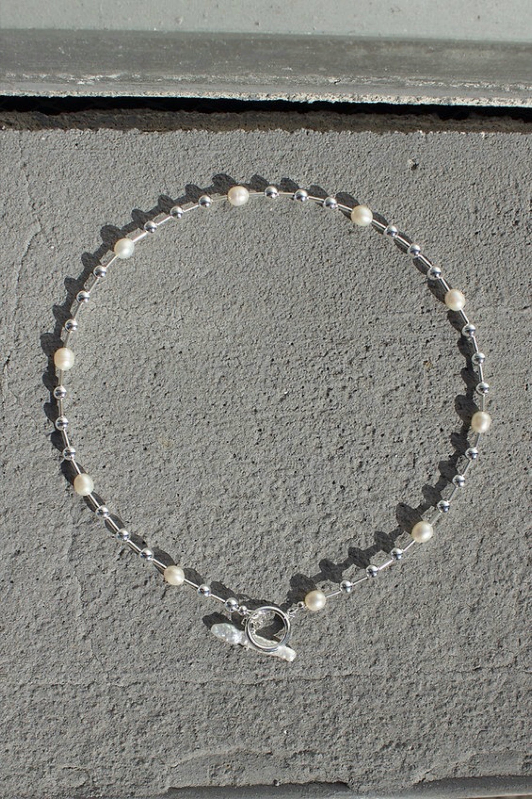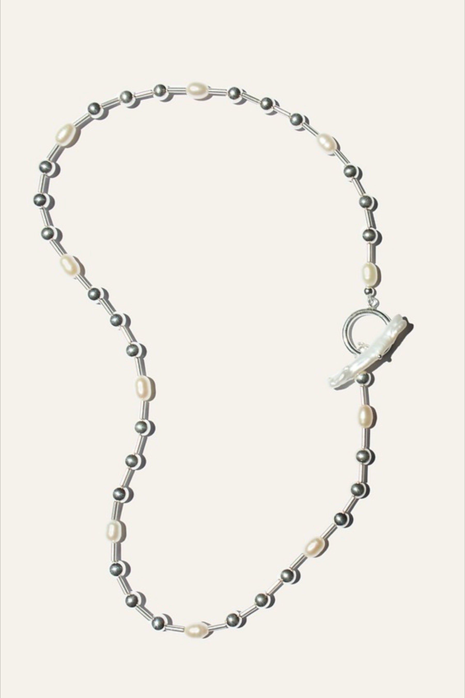 Sterling silver beaded necklace with freshwater white pearls. Finished with our signature Biwa pearl clasp.