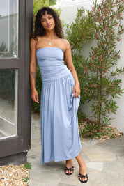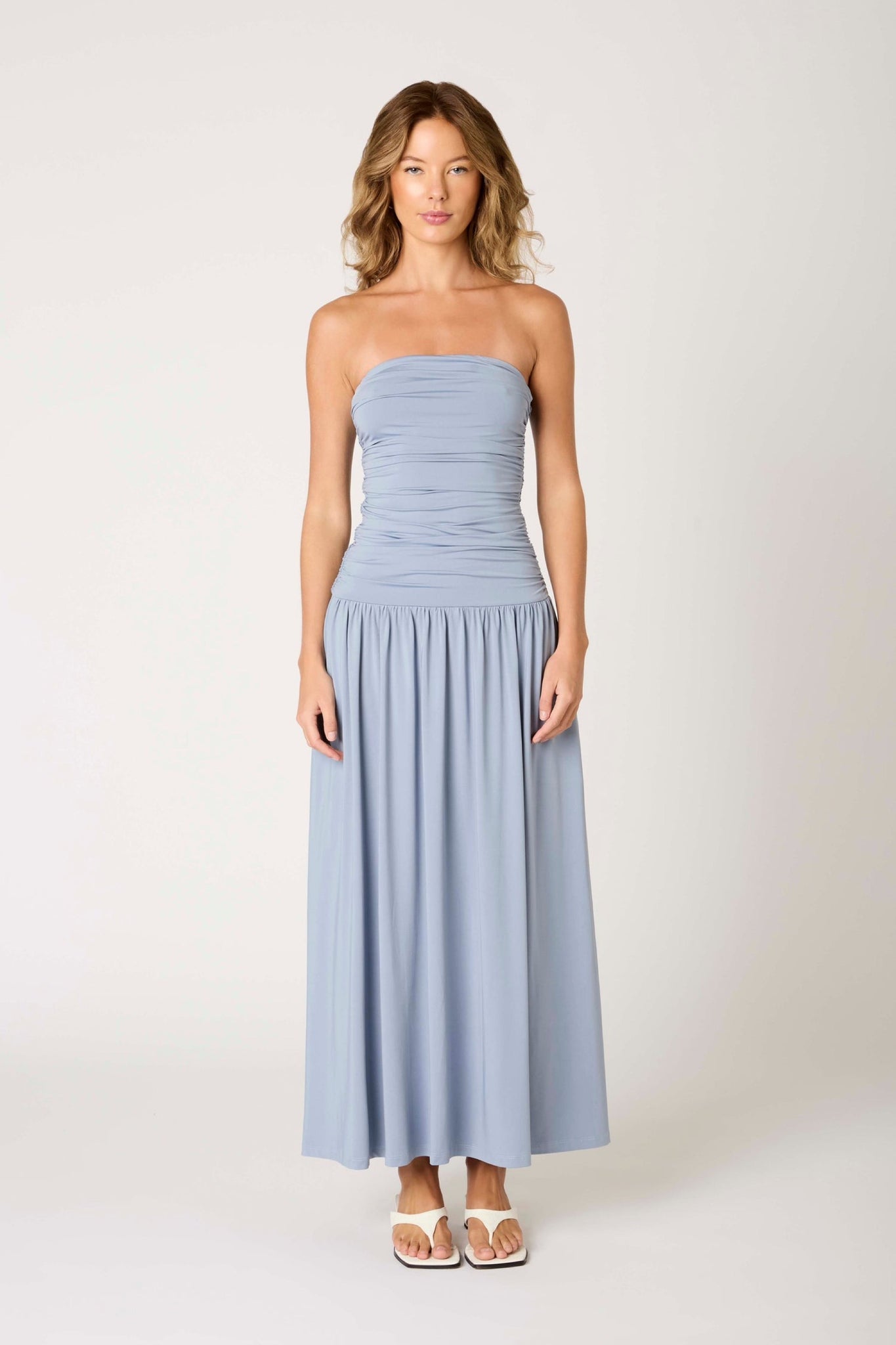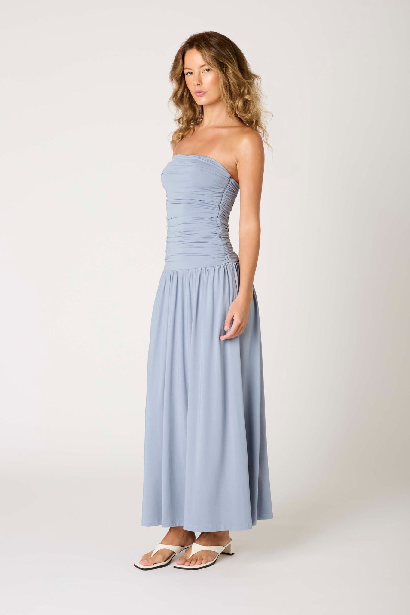 Effortlessly chic and versatile, our Slate Blue Santal Dress flatters with a strapless cut and ruched drop waist. Perfect for any occasion, this midi dress takes you from day to night with ease.