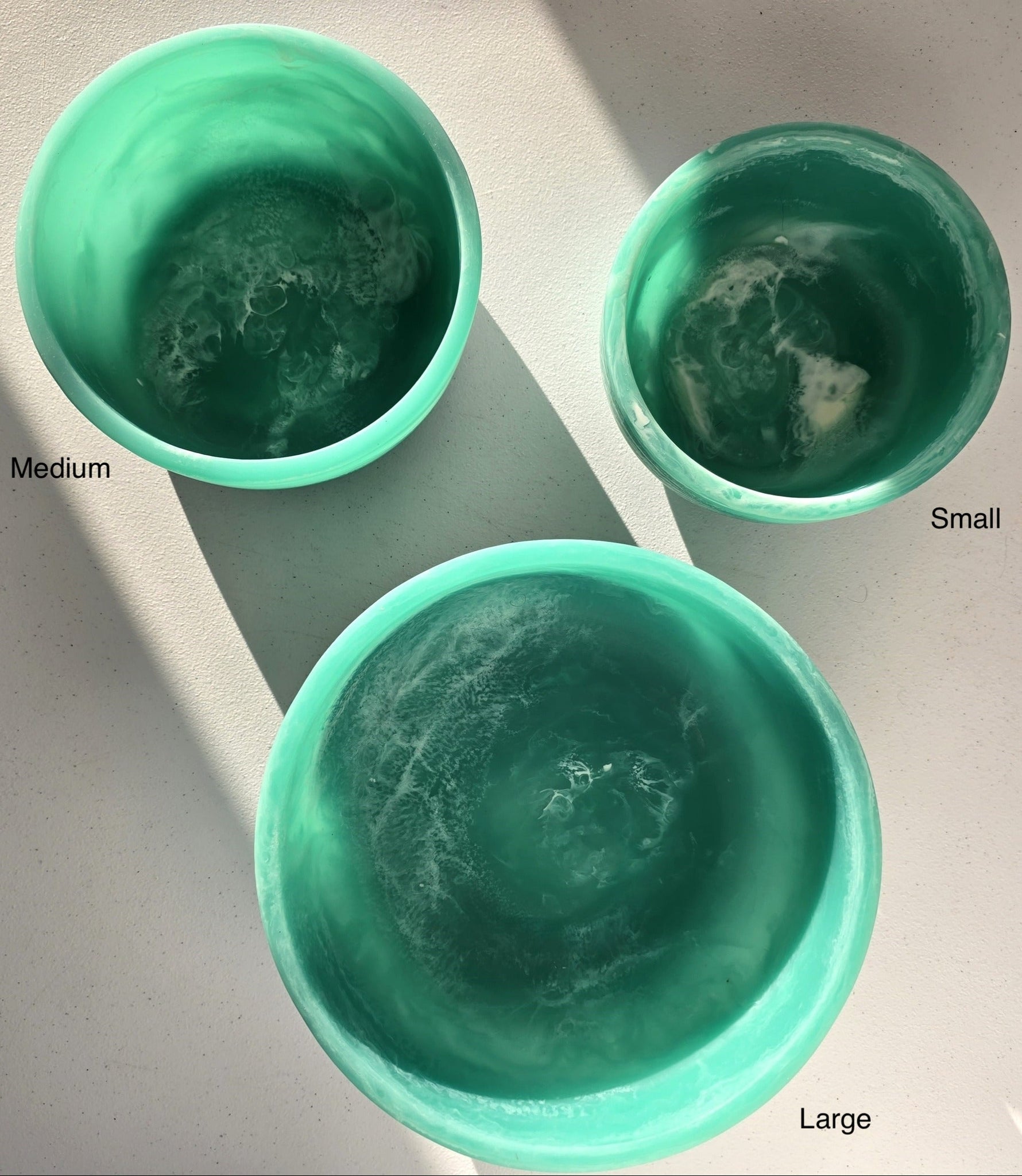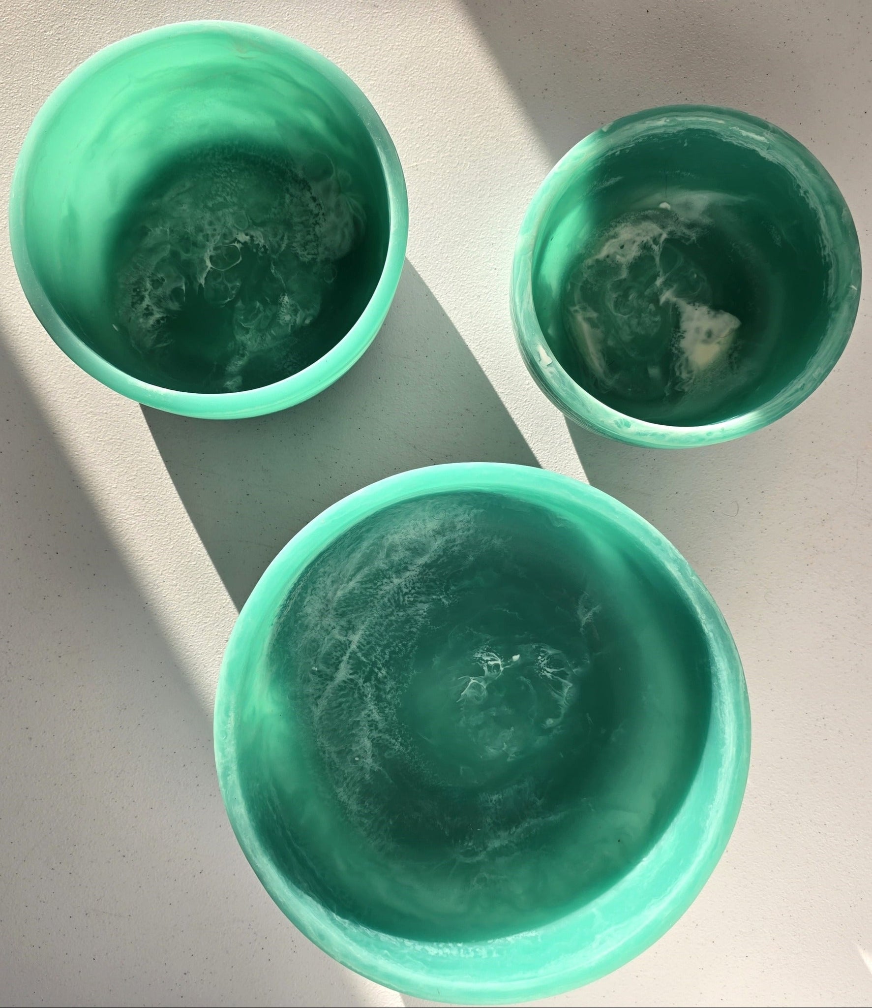 The vibrant, swirled design of these resin serving bowls is a result of carefully chosen colors. Each piece is hand-poured individually, so no two pieces will ever be same. Great for indoor and outdoor entertaining alike.