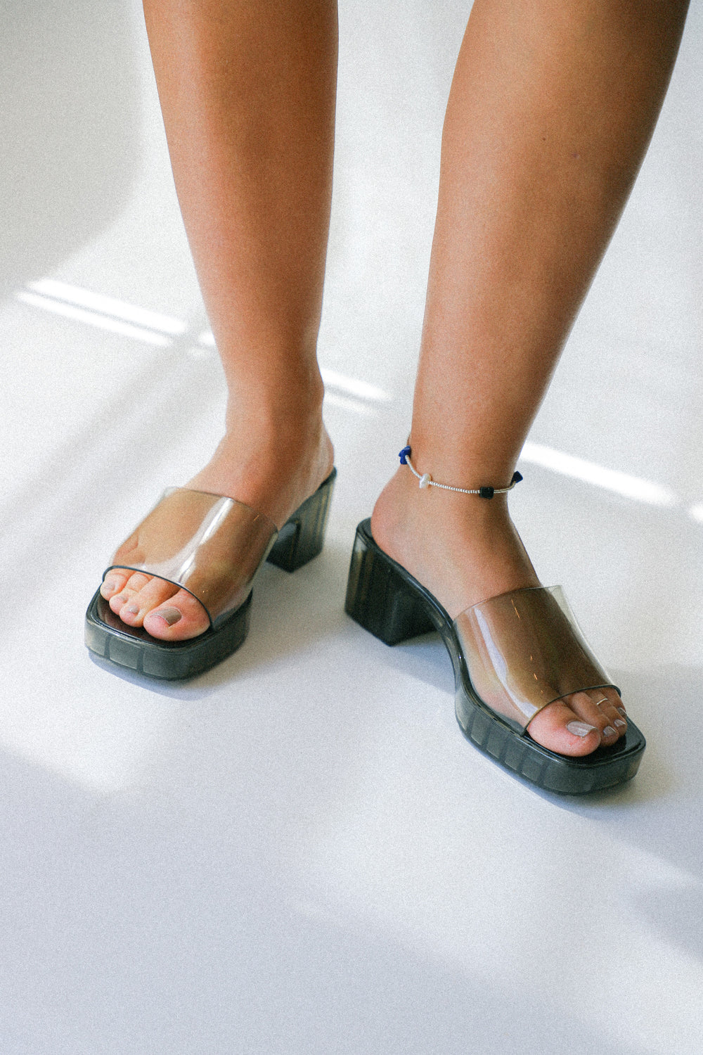 Vegan, 80s-inspired heeled jelly sandal featuring a block heel and platform.