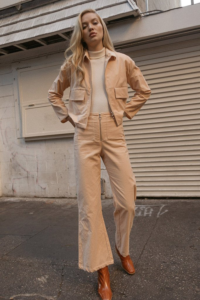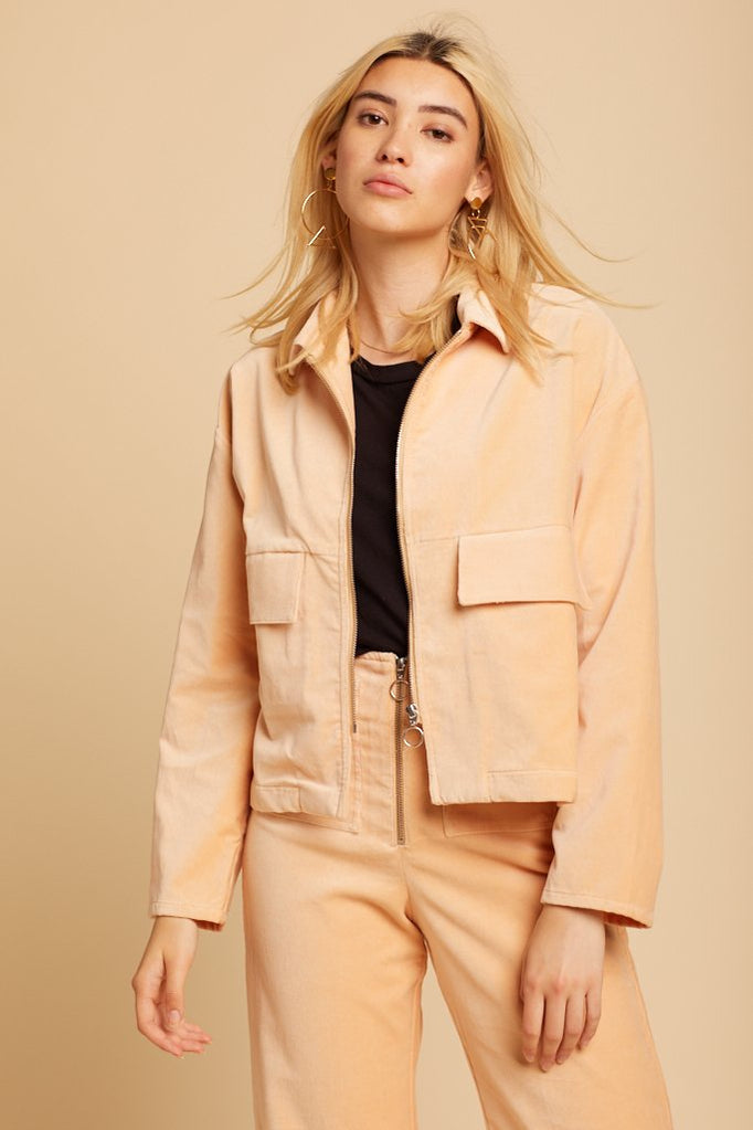 Soft pink velvet jacket with zip closure and a flattering boxy fit with front pockets. Pair with the Soft Pink Wadi Pant for the complete look.