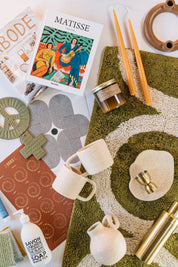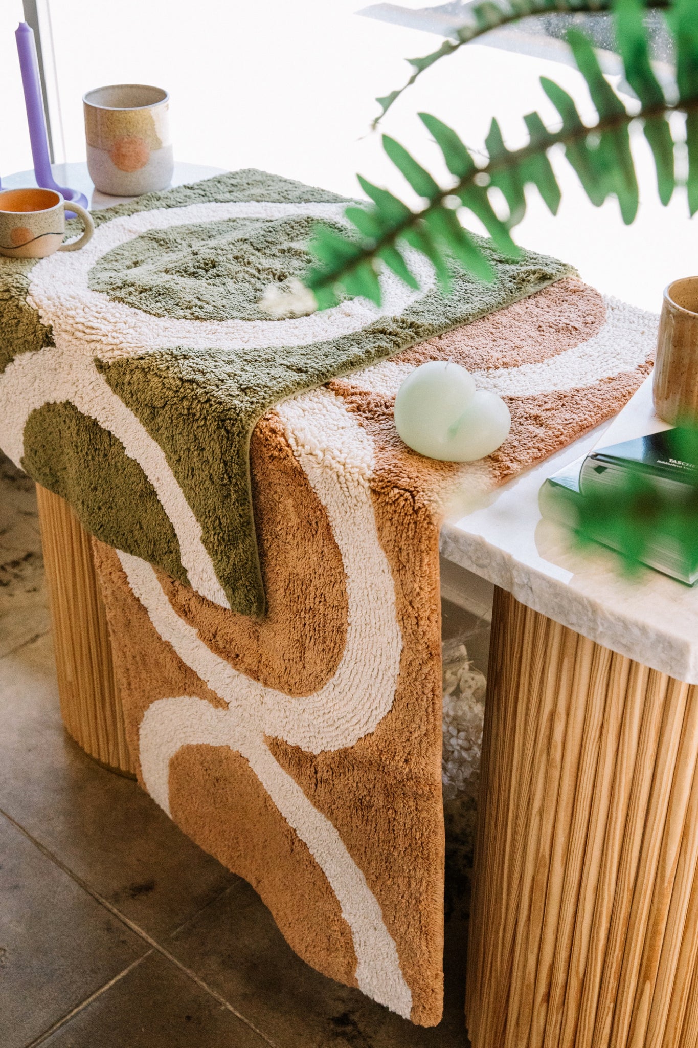 The Palomino Bath Mat has a geometric design in Moss and Natural and is handmade of plush tufted cotton. Ethically produced and hand tufted in India.