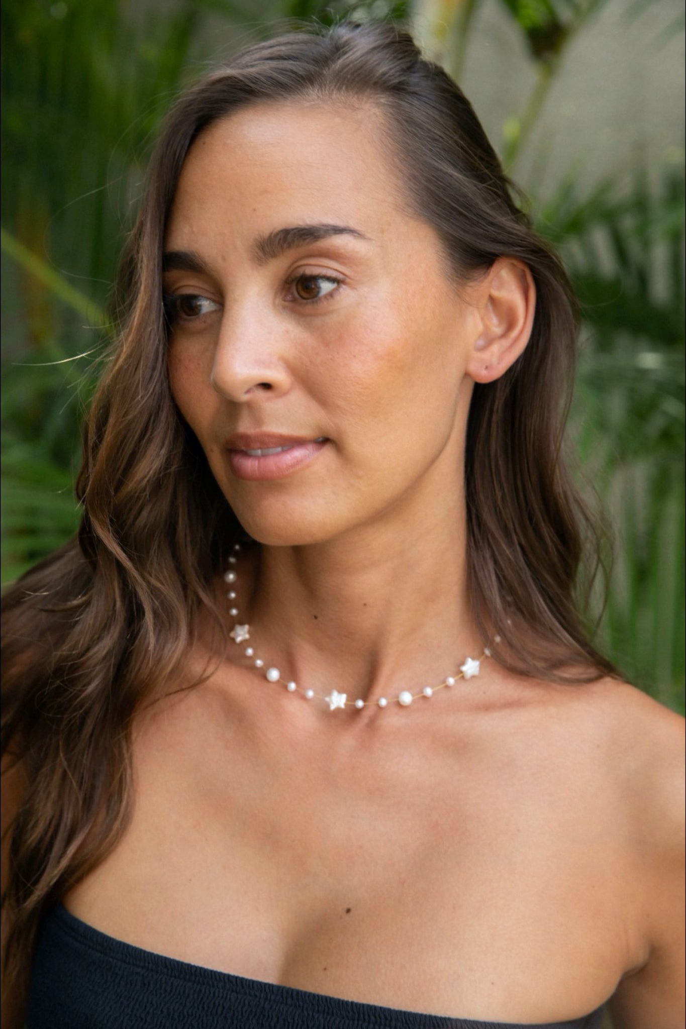 Pearlescent floating necklace with mixed round and star shaped pearls.