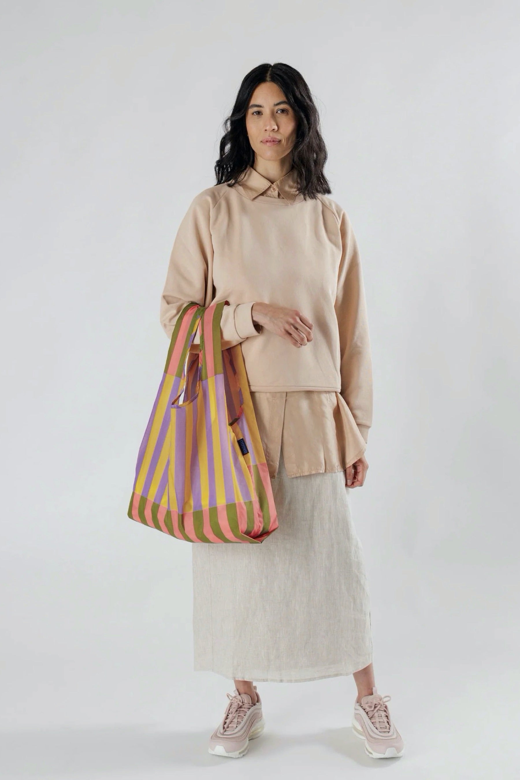 This reusable bag is not just for the grocery store. Carry in your hand or over your shoulder. Holds 2-3 plastic grocery bags worth of stuff. Folds into a flat 5 in. x 5 in. pouch. Holds 50 lbs. Machine washable.