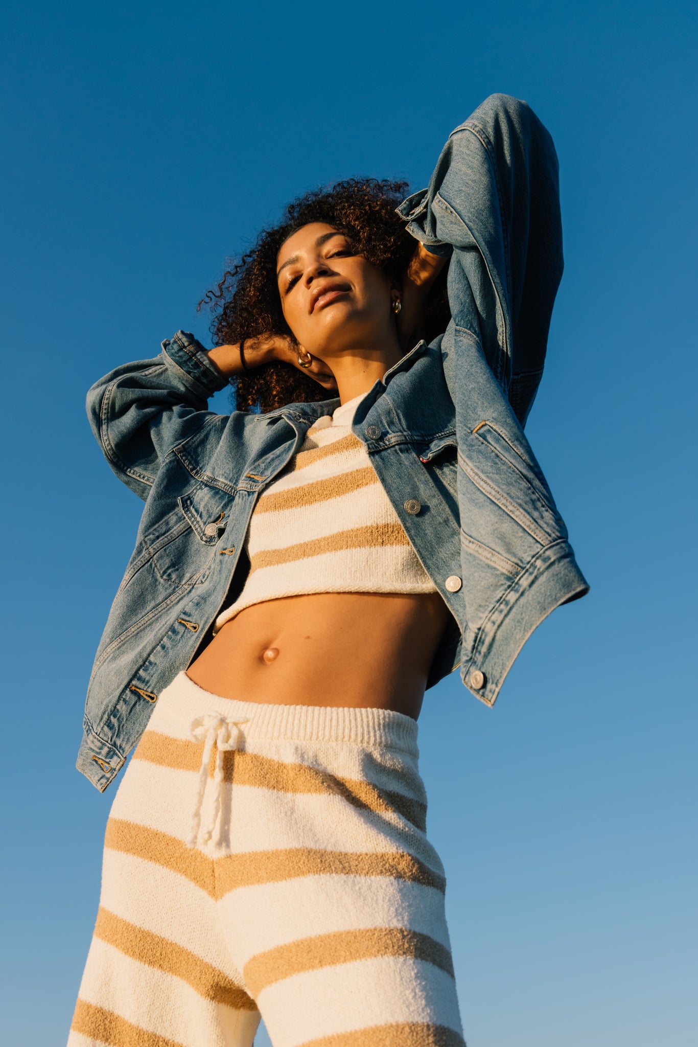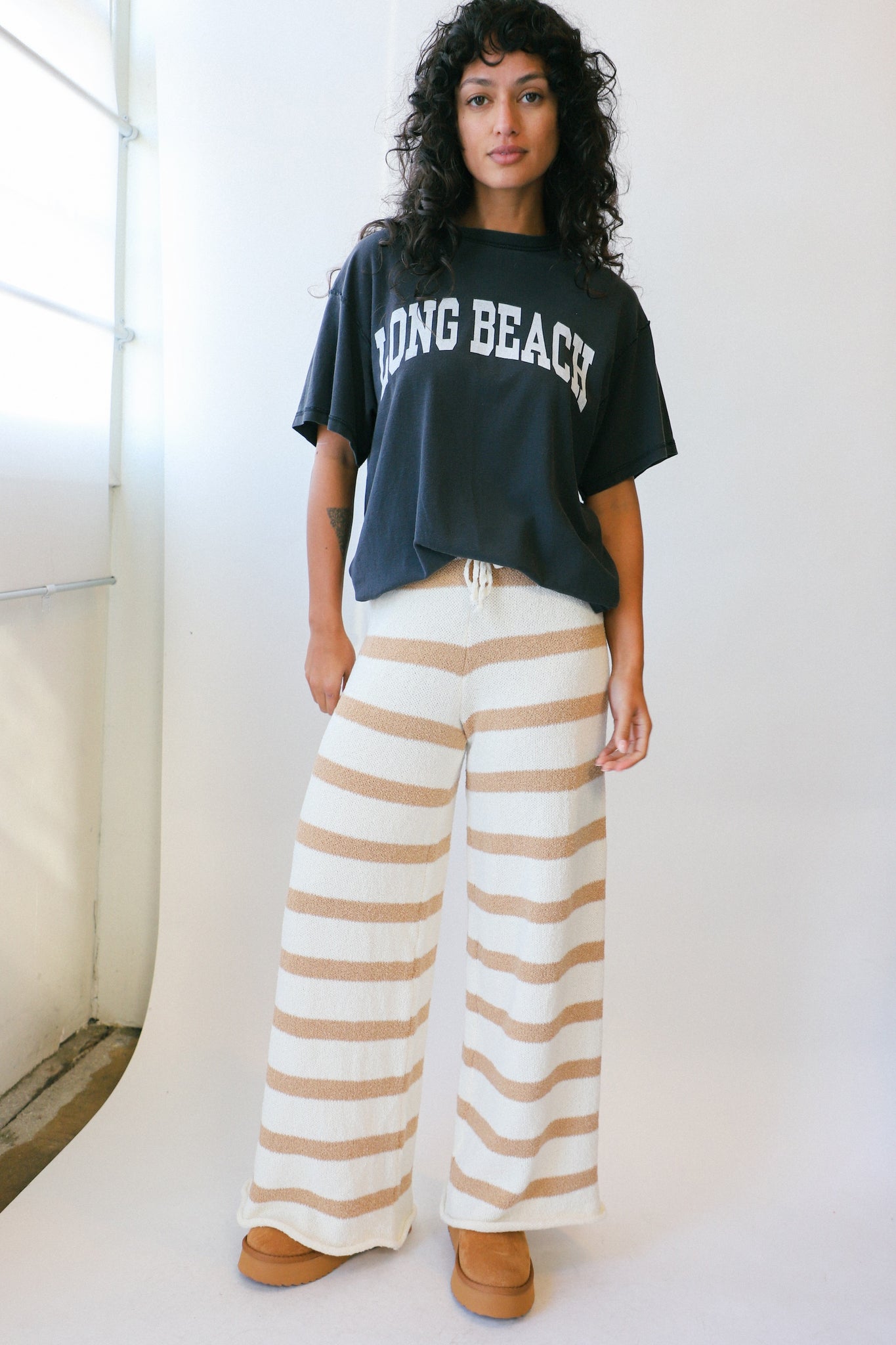 Get ready to stand out with our Tan Stripe Jordan Pants. Featuring a wide and eye-catching stripe pattern, these knit pants are perfect for making a bold statement while staying comfortable.