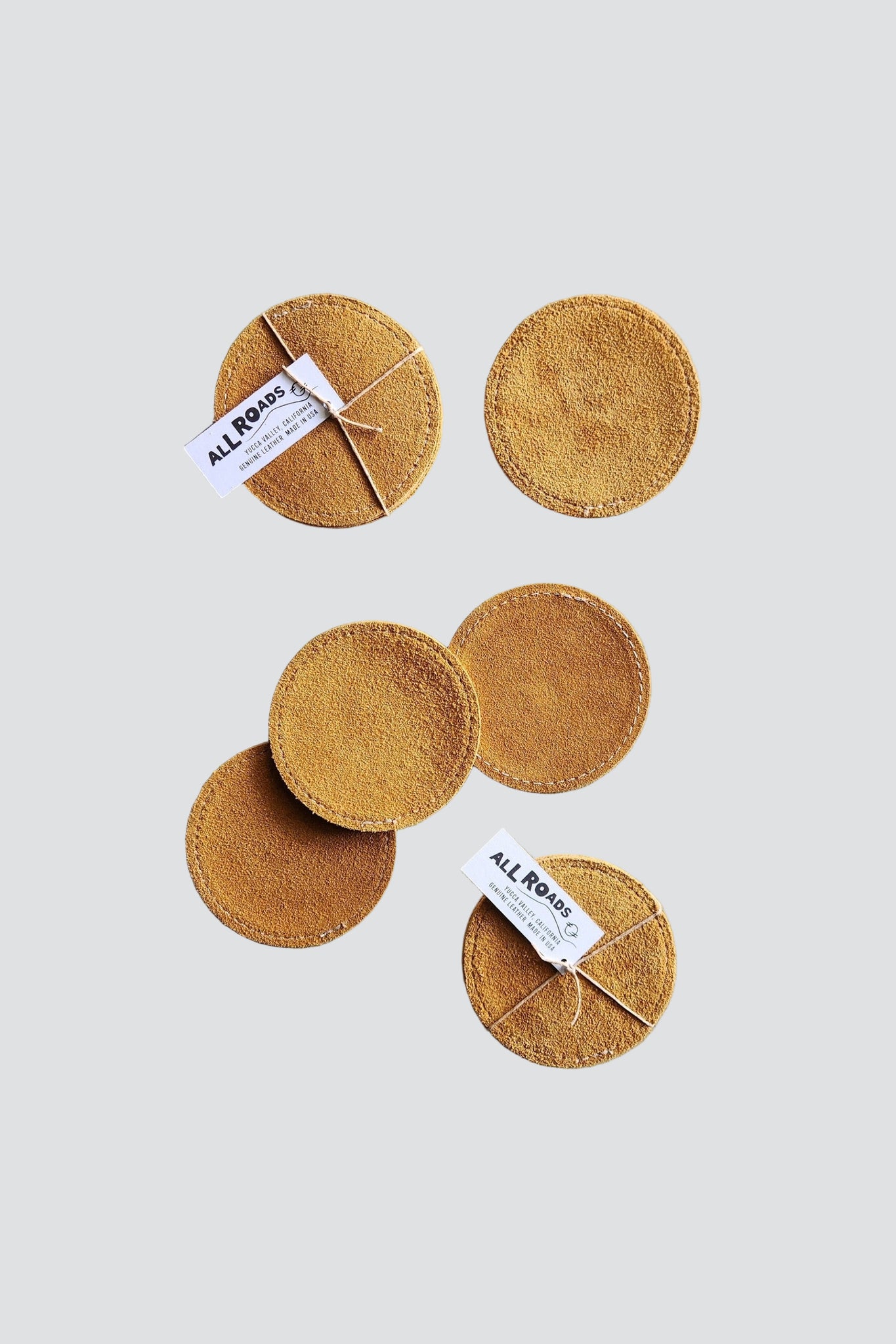 Double-sided suede coasters. One side of the coaster is Toast, the other side is light tan suede. Set of 4.