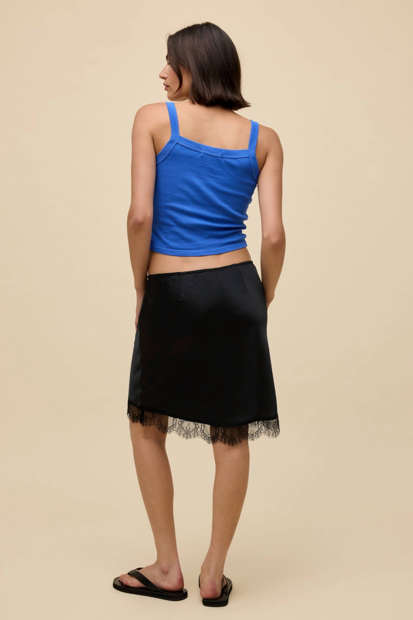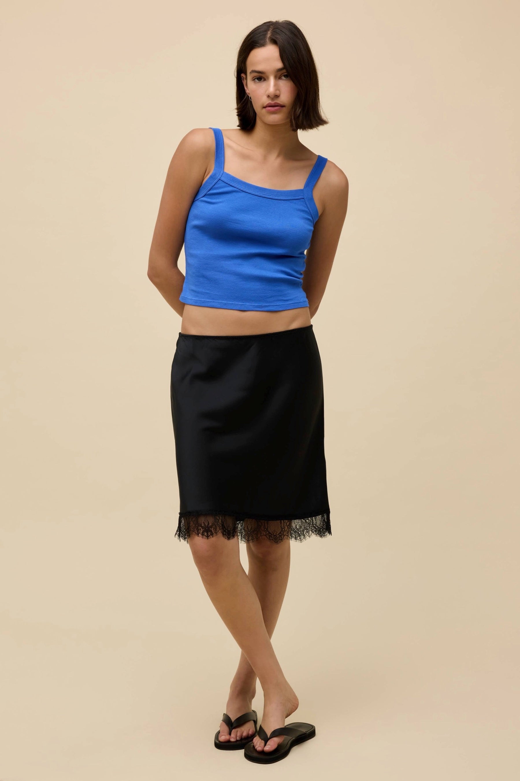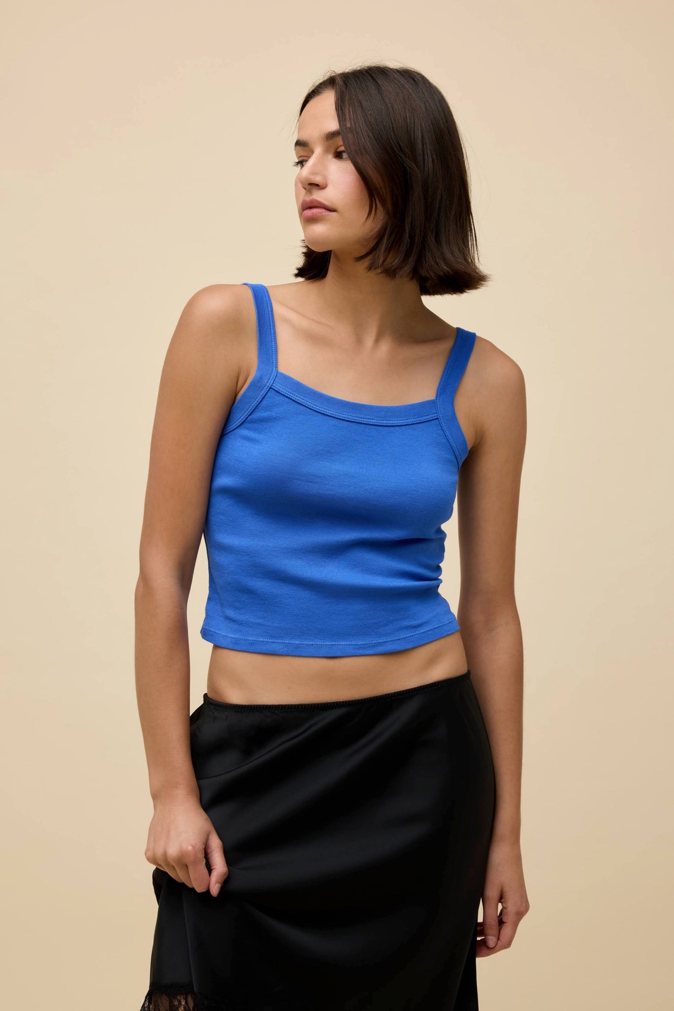 Shrunken and ribbed with a square neckline and thicker straps reminiscent of the 90s. Make it a key layering piece or the main moment.