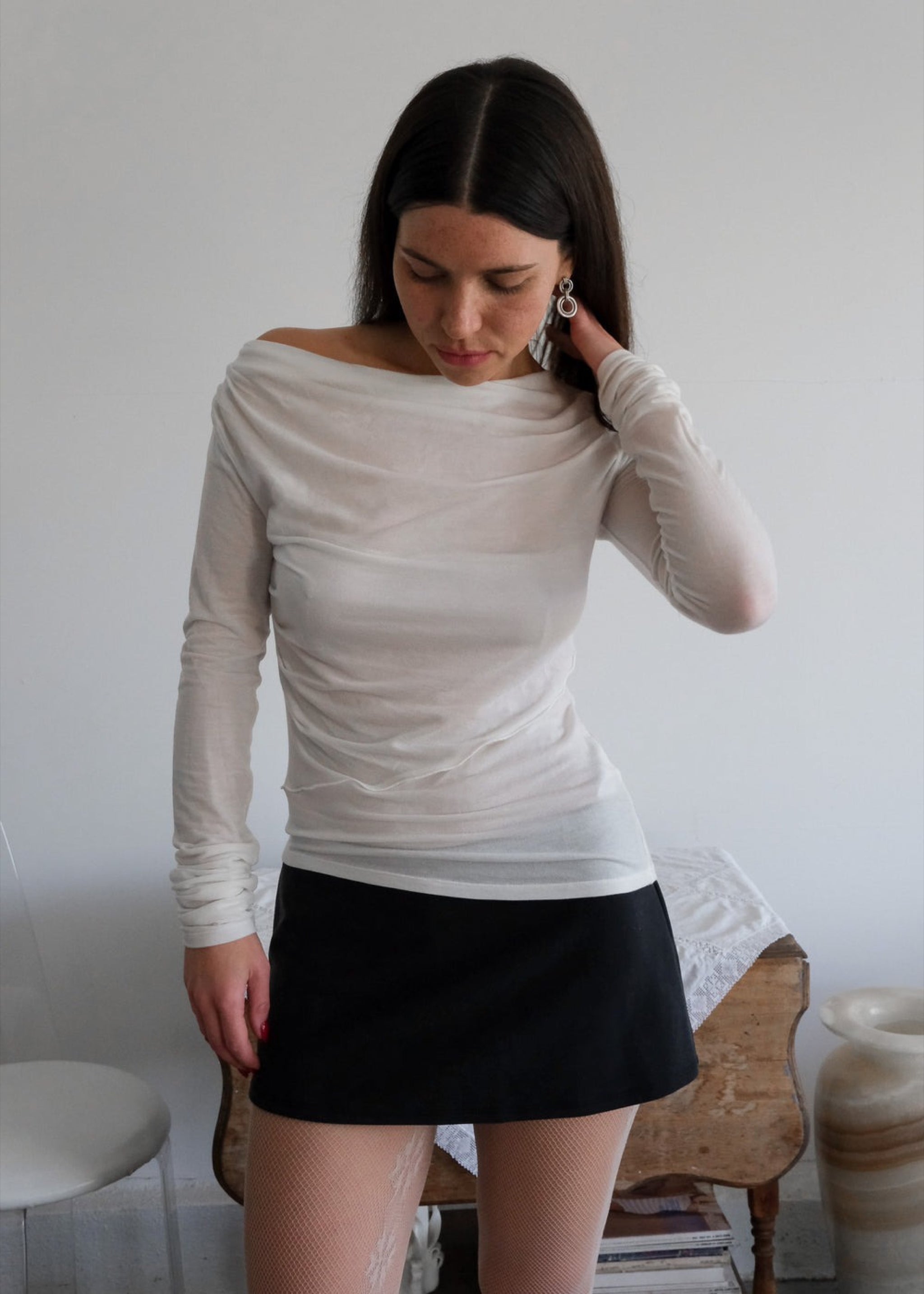 A draped neck long sleeve knit top. Made from a super stretchy semi sheer tencel. Features an asymmetric hem.