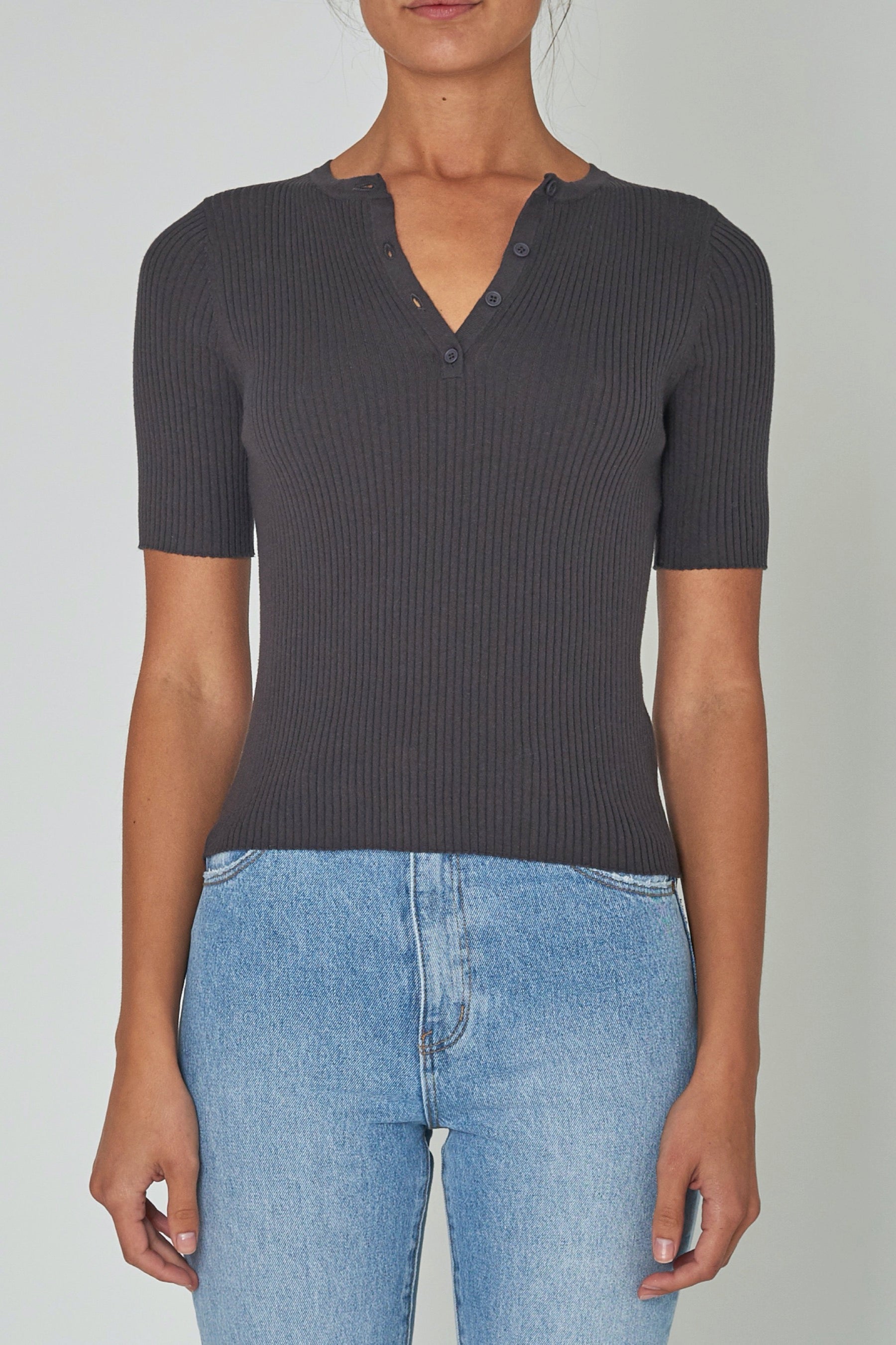 Short sleeve top made of a soft rib textured knit and a button front v-neckline.