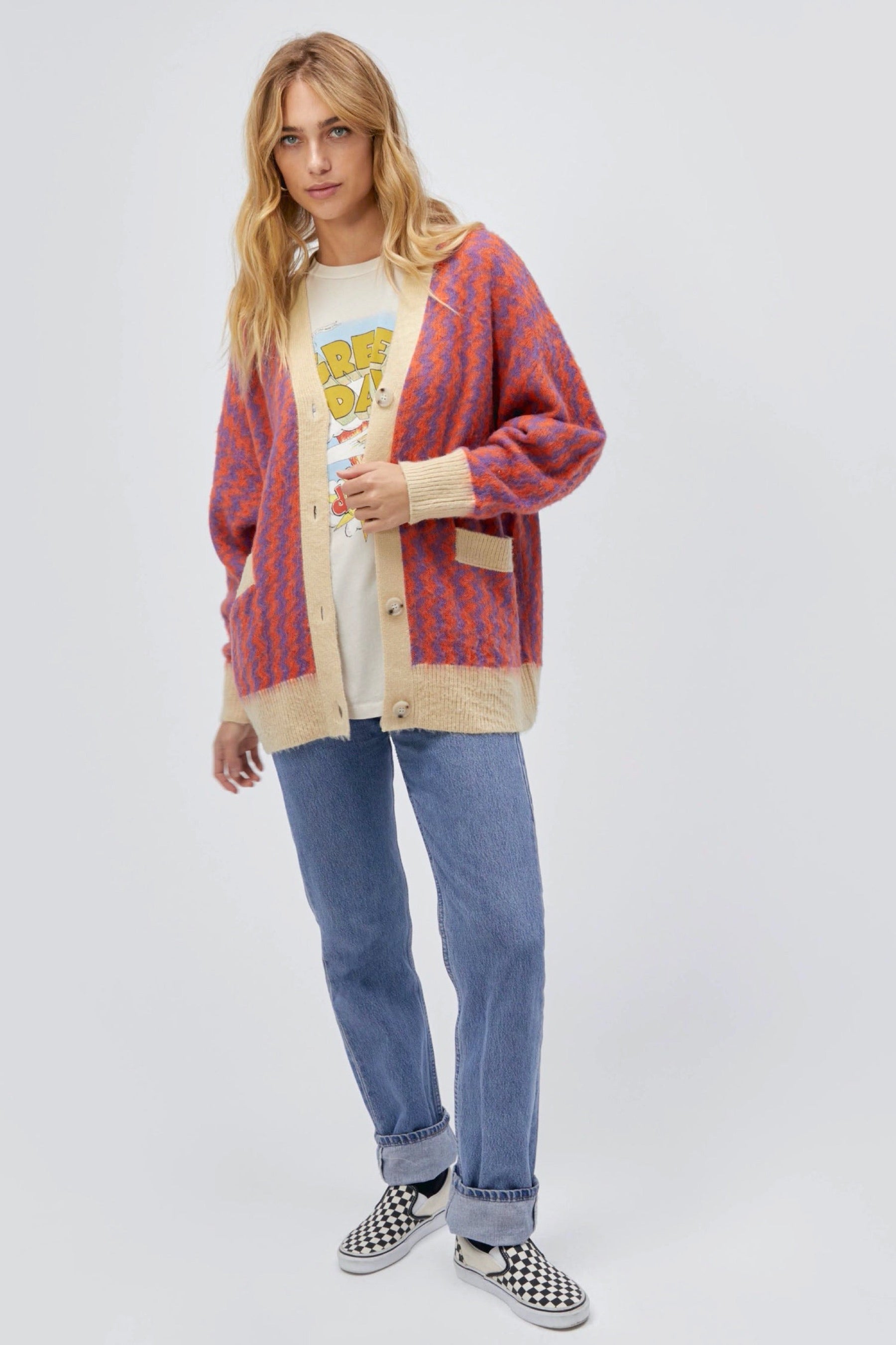 Button up, or worn open, this relaxed fit knit is decked out in bright contrasted zig zags. Get your hands on this soft-touch knit that comes with a brushed texture effect.
