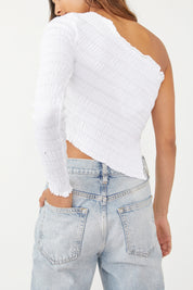 The perfect transeasonal staple, this top is featured in a one-shoulder silhouette with asymmetrical hem and smocked fabrication throughout for added texture.