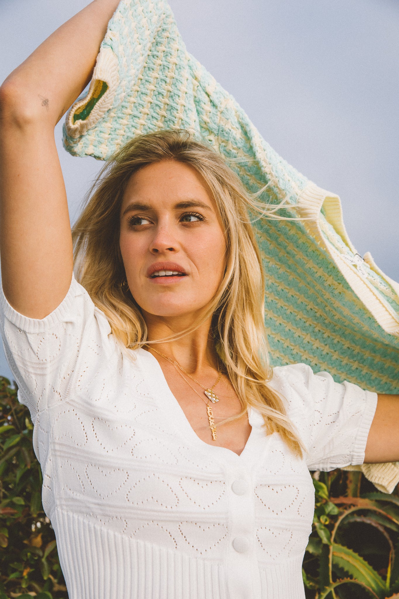 Effortless heart stripe pointelle cropped cardigan featuring a plunging neckline and cozy wide rib panel detailing at hem and puff sleeves.