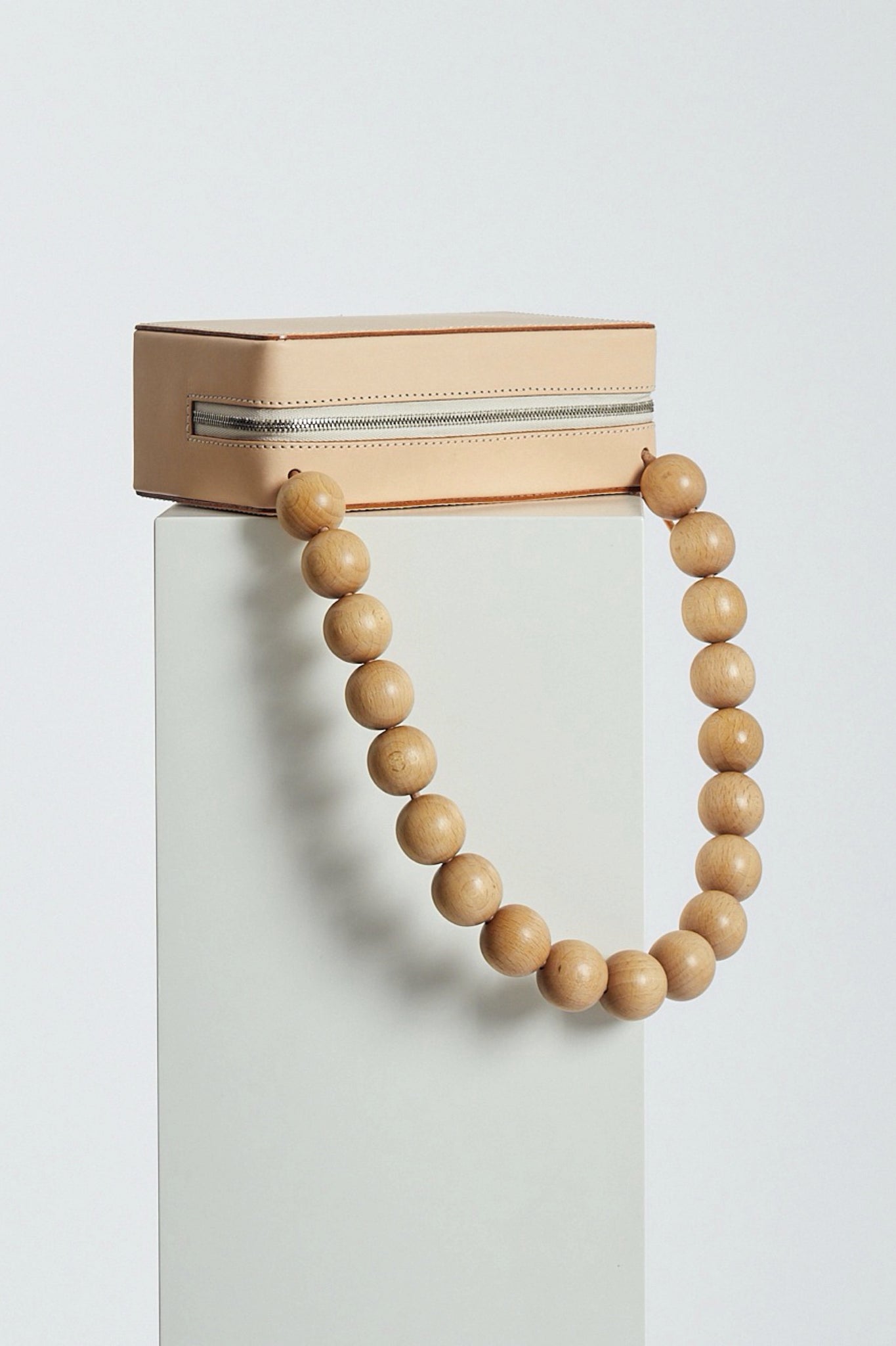 Structural brick shaped bag in Natural vegetable tanned leather, wood bead shoulder strap, silver zip closure.
